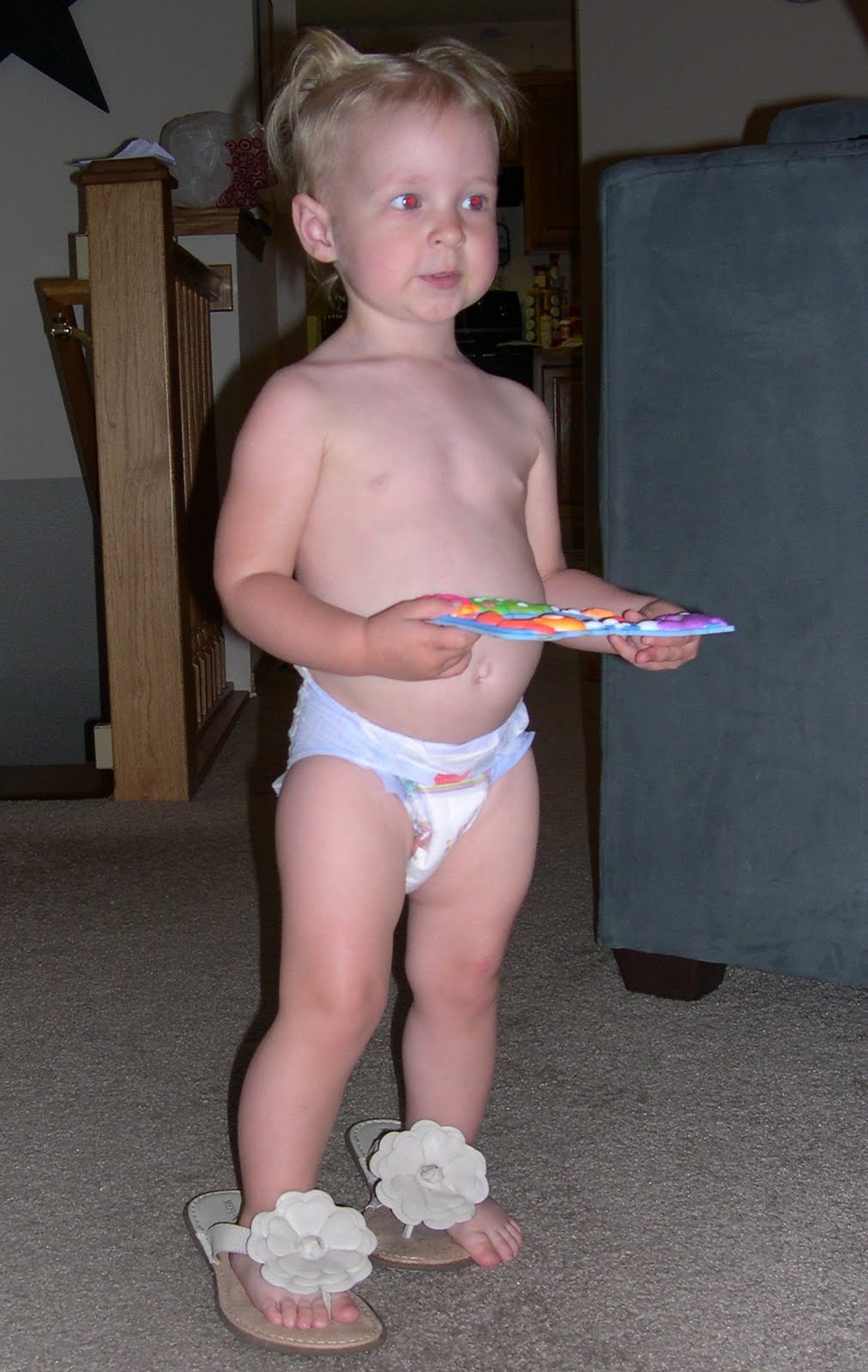 How did it go? Well, she normally is in bed by 8:00. She us USUALLY asleep by about 8:3o. Every once in a while she gets a wild hair and decides to talk until 9:15. So we kept to her schedule pretty well. By about 8:50, she had been out of bed more times than I can remember. She shut the door on two occasions and I found her with books in her bed on two occasions. After spanking her and she STILL got out of bed, I decided to try a method that I had tried before. I put her back in bed and then parked myself on the floor facing the door (with my back to her). At first it didn't go so great. She purposely threw Dumpty out. So, I put her back in bed each time without talking. After the 4th time of this, I didn't give Dumpty back. I put Dumpty in another place, then placed Jesstine back in bed. She of course cried. After a few min. (and an attempt by Jesstine to go and get Dumpty, I gave Dumpty back. I positioned myself a little further away. She got out of bed once (after about 5 min.). Put her back and sat on the floor. It worked! She stayed in bed. For a while she talked and tried to get my attention. At one point I was chuckling inside because she started counting. It was like the old "counting sheep" method. She surprised me with how high she could count! She would sometimes leave out three and once she got to eight, she was lost so she would just repeat numbers before eventually starting over. Every 5-10 min. I would move slightly closer to the door. By 9:30, I didn't hear a sound. I left her room at 9:35. She slept all night long and woke up just before 7. She got up, shut her door and read books! It was kind of nice to not have to go get her right away!!! She entertained herself! We will just see how naptime in the big girl bed goes!!